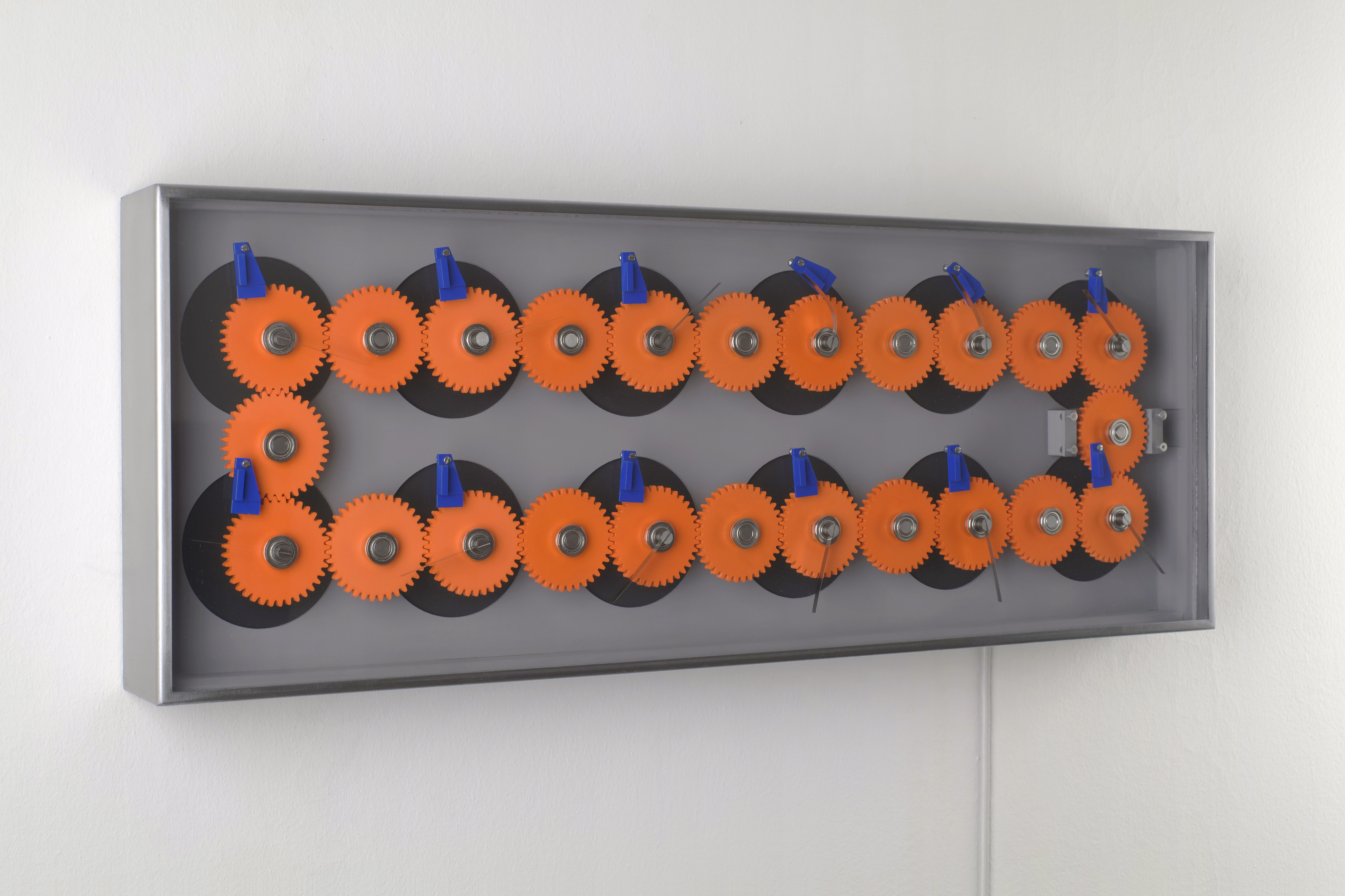 Eine transparente Acrylglasplatte dient als Bildträger für zwölf Federstahl-Zeiger und Fallblättchen aus dunkelblau pulverbeschichtetem Aluminium. Die Zeiger werden mit Hilfe von 3D gedruckten Zahnrädern